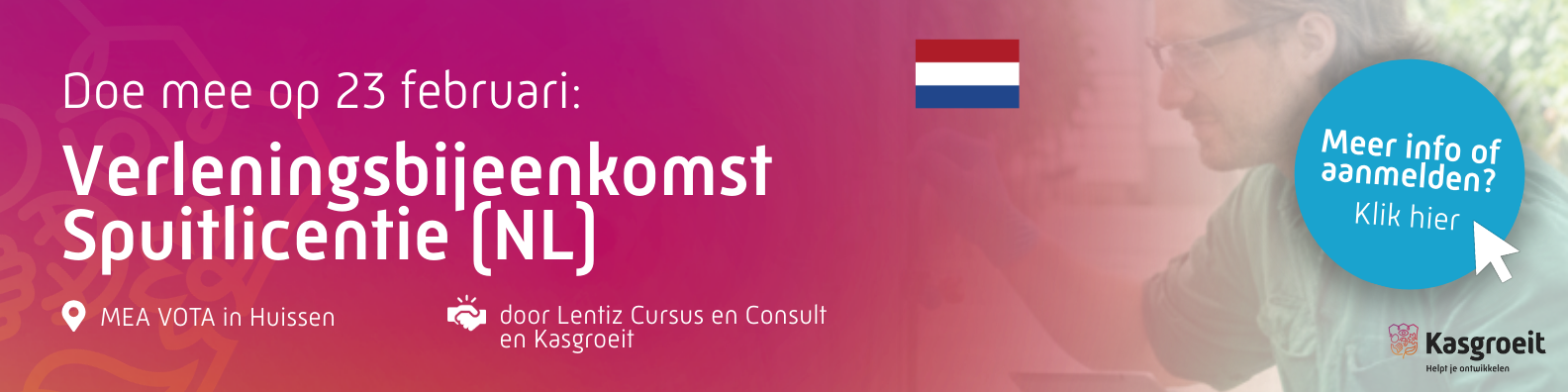 Op 23 februari 2026 vindt een fysieke verlengingsbijeenkomst (Nederlands) plaats over Veiligheid en Techniek (deze bijeenkomst levert 1 spuitlicentiepunt op). De bijeenkomst wordt georganiseerd door Kasgroeit in samenwerking met Lentiz Cursus en Consult en Greenport Arnhem-Nijmegen, van 19:00 tot 21:30 uur. Je bent van harte welkom om deel te nemen, wanneer je je hebt aangemeld.