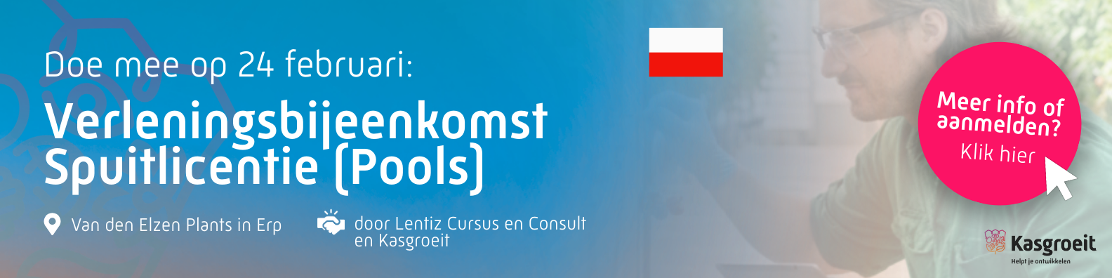 Op 24 februari 2026 vindt een fysieke verleningsbijeenkomst (Pools) plaats over Veiligheid en Techniek (deze bijeenkomst geldt voor de spuitlicentiepuntentelling). Voor meer informatie kun je contact opnemen met Arna Vliegen-Verschure via a.vliegen@kasgroeit.nl of 06-15157442, of klik op de onderstaande banner om gelijk naar de inschrijving te gaan.
