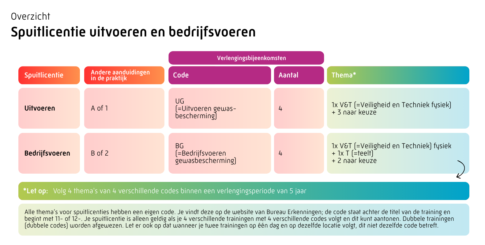 De informatie staat overzichtelijk in de onderstaande tabel. Voor het volledige overzicht kun je terecht op Welke nascholingsbijeenkomsten moet ik volgen? – Bureau Erkenningen. Het Bureau Erkenningen is de officiële organisatie die spuitlicenties beheert, verlengingen goedkeurt en aangeeft welke nascholingsbijeenkomsten nodig zijn om je licentie geldig te houden. Voor meer algemene informatie over spuitlicenties en de nieuwe regels lees je Alles wat je moet weten over de spuitlicentie: nieuwe regels, tips en verlenging – Kasgroeit.
