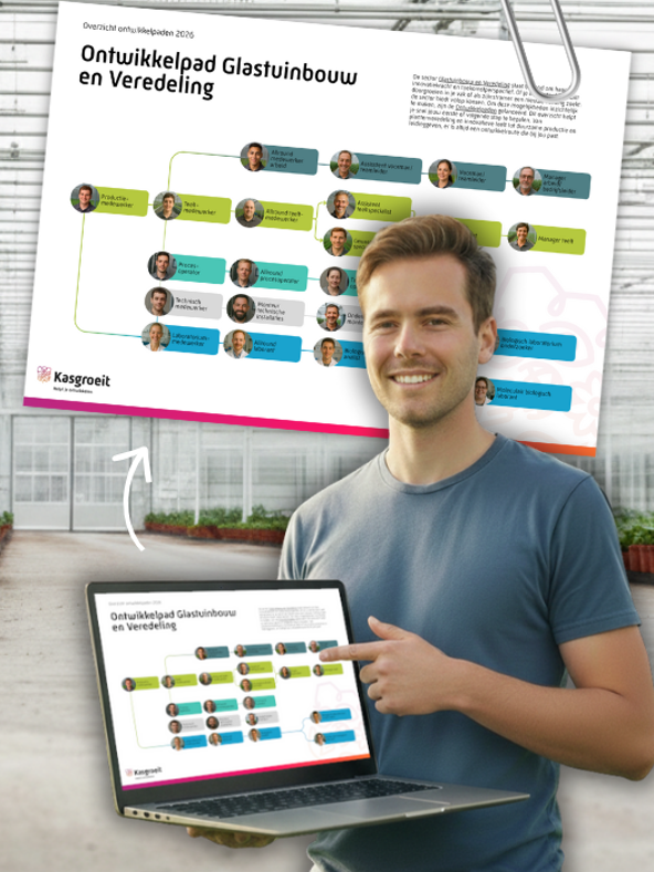 Om je ontwikkelvragen te beantwoorden, heeft onze partner Glastuinbouw Nederland in samenwerking met Kasgroeit, opleiders en bedrijven de ontwikkelpaden ontwikkeld. Dit is een praktisch overzicht dat je direct alle mogelijkheden in de kas laat zien. Op onze website kun je deze overzichtelijk bekijken en ontdekken welk pad bij jou past.