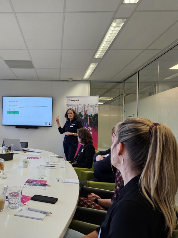 Tot slot vertelde Arna over de samenwerking tussen Kasgroeit en Stichting Lezen en Schrijven. Bedrijven krijgen gratis ondersteuning en advies op maat, bijvoorbeeld bij het organiseren van taalles of het versimpelen van veiligheidsinstructies. Investeren in basisvaardigheden levert veel op: meer productiviteit en kwaliteit, meer motivatie en behoud van personeel, minder verzuim en veiliger werken.
