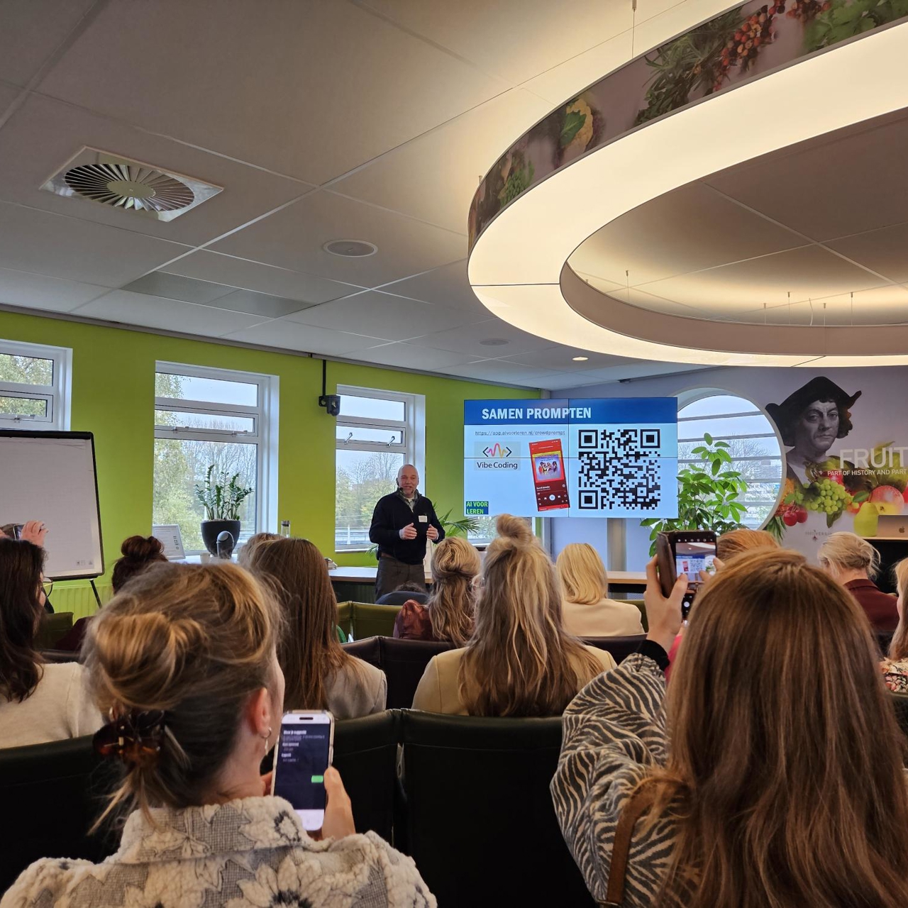 Tijdens de training liet AI-specialist Serge de Beer zien hoe je kunstmatige intelligentie vandaag al praktisch kunt gebruiken. Hij gebruikte voorbeelden van tools zoals ChatGPT, CoPilot (Microsoft), Gemini (Google) en Claude. Volgens hem werkt AI in drie stappen: analyseren (wat wil je doen en welke informatie gebruik je?), genereren (hoe laat je AI iets nieuws maken?) en automatiseren (hoe laat je AI taken automatisch doen?).